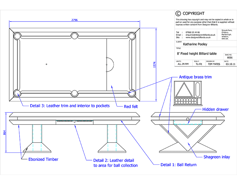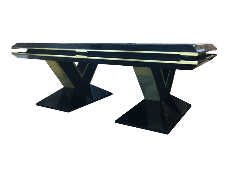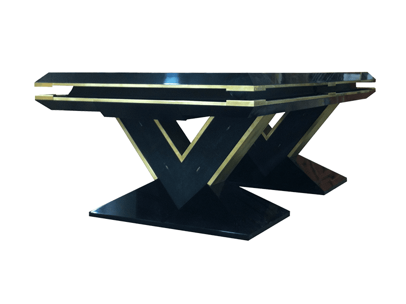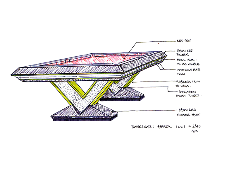A striking design with an ebonised finish, complementing the Shargreen legs and brushed brass detailing. The concept sketch was presented to us by an interior designer, which we then developed to a full design in collaboration with the designer and client. As is the case with all our tables, the design was developed using CAD, to produce the technical drawing’s, 3D perspective image and animations to finalise the design before construction.