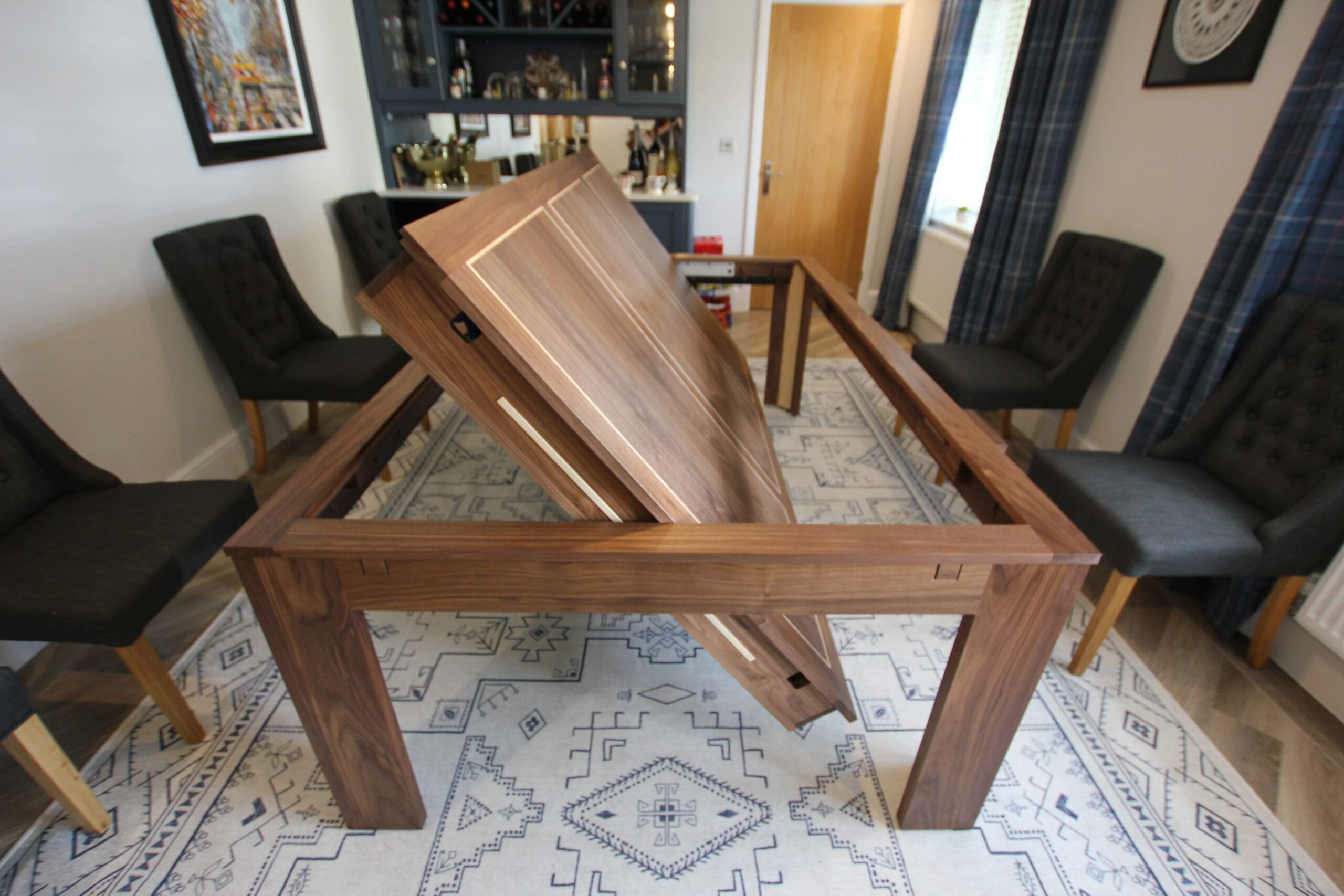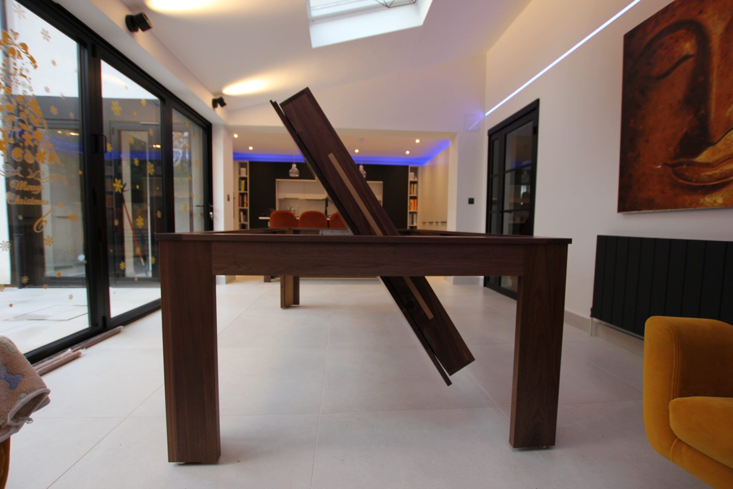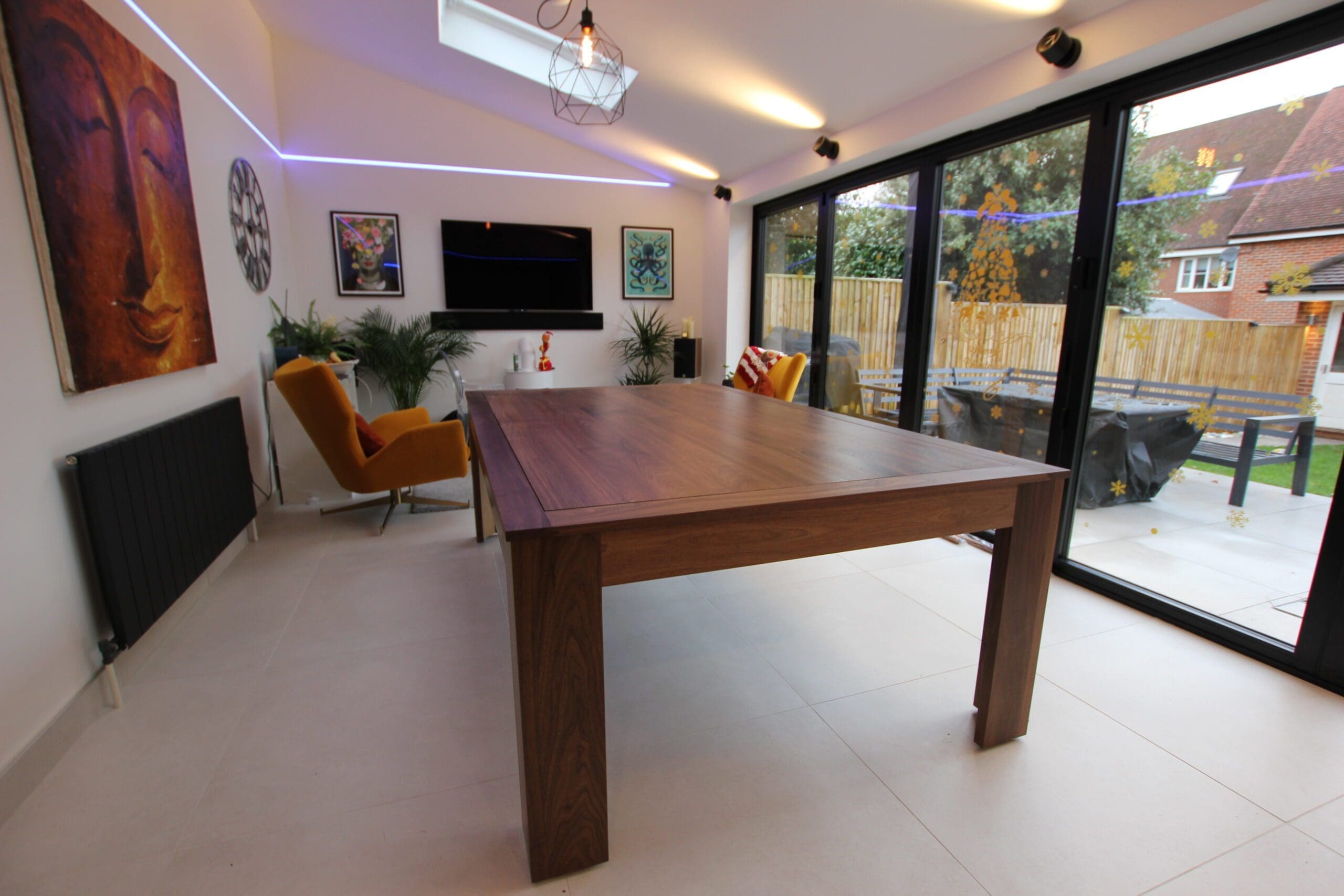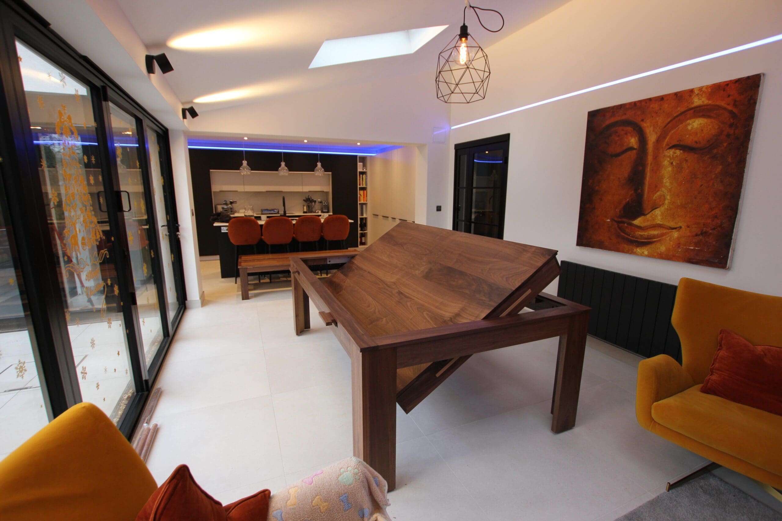 The Exquisite rollover pool dining table is available in both English and American pool specifications 5, 6, 7 & 8ft. As with all our rollover tables, the design can be customised or tailored to your exact requirements, whether it’s custom materials, finishes or bespoke design modifications.