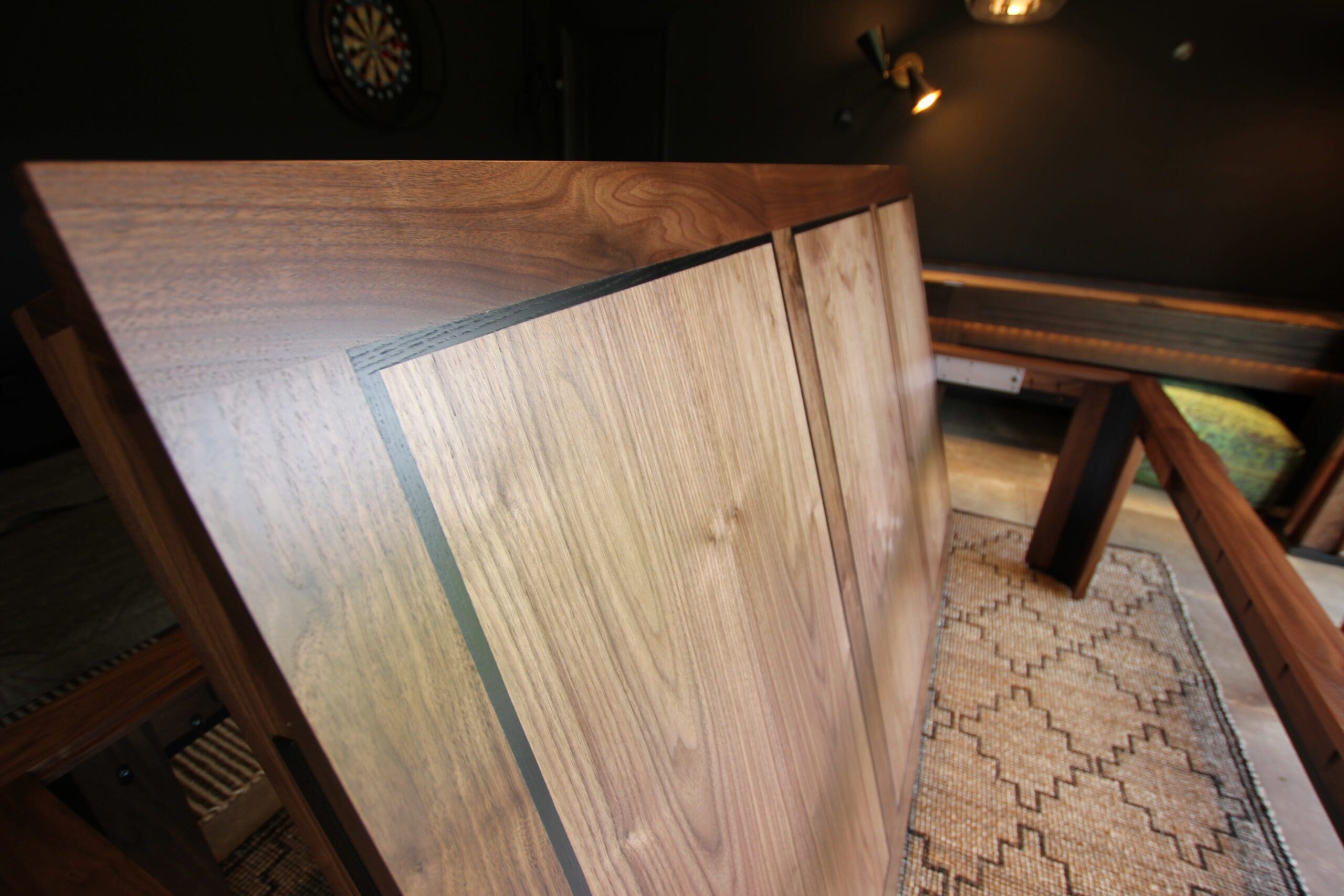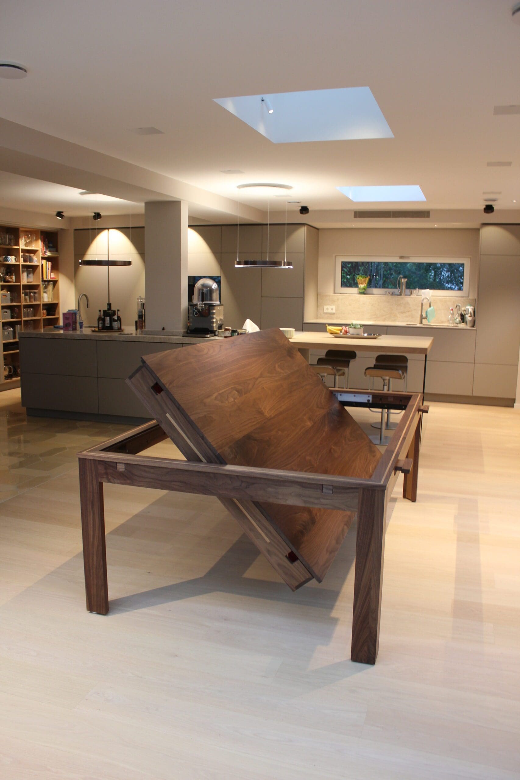 The rollover features a safety mechanism which comprises a Rack and Pinion gear system, including soft close dampers and pressurized cylinders to counterbalance the weight, resulting in smooth and effortless rotation from dining to pool table.